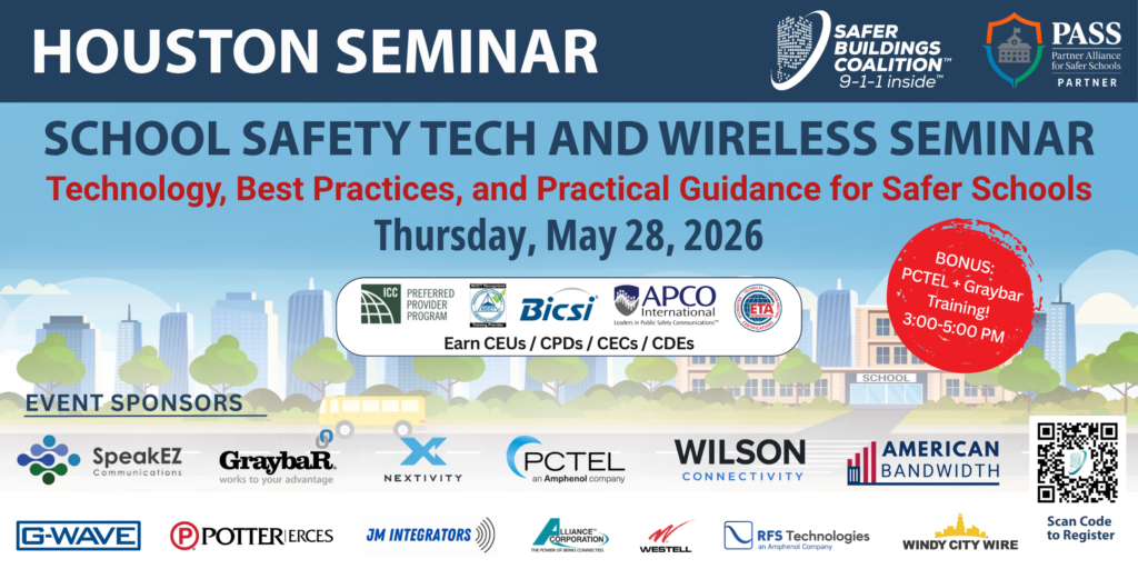 Hosted by Safer Buildings Coalition leadership and subject matter experts, this interactive seminar addresses the critical intersection of school safety technology, emergency alert systems, and in-building wireless communications. Content is tailored to include state and local requirements applicable to your region.